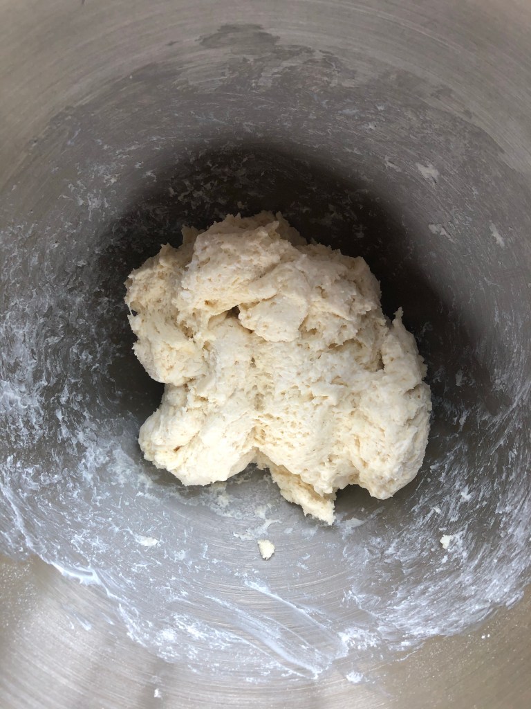 - In mixing bowl with dough hook, mix 1 1/2 cups self rising flour with 3/4 cup Greek yogurt and 1 egg (the dough is going to be sticky that’s ok).