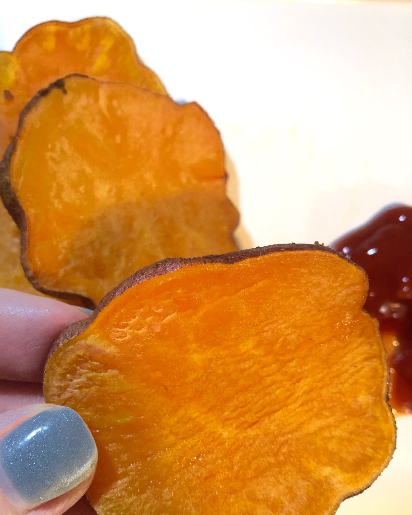 - Slice sweet potato into thin rounds. I do it this way because it’s easy and simple. Plus it makes some crispy (which I like) and some softer (which my husband likes).
