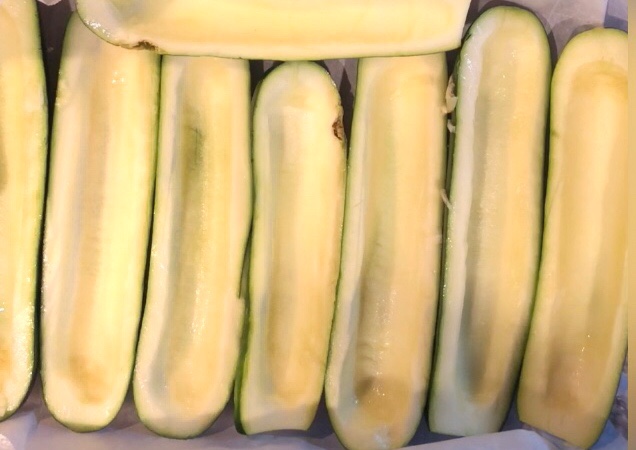 A tip on getting the insides of the zucchinis out: score the centers with a knife to break it up a bit. Use a spoon to scoop out centers. This makes scraping out the centers a lot easier.