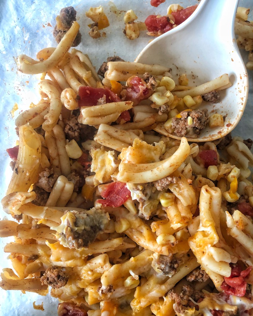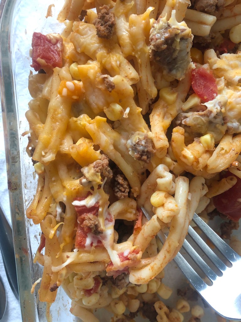 - Pour ground beef mixture into pasta and corn. Stir around so all ingredients are fully mixed.