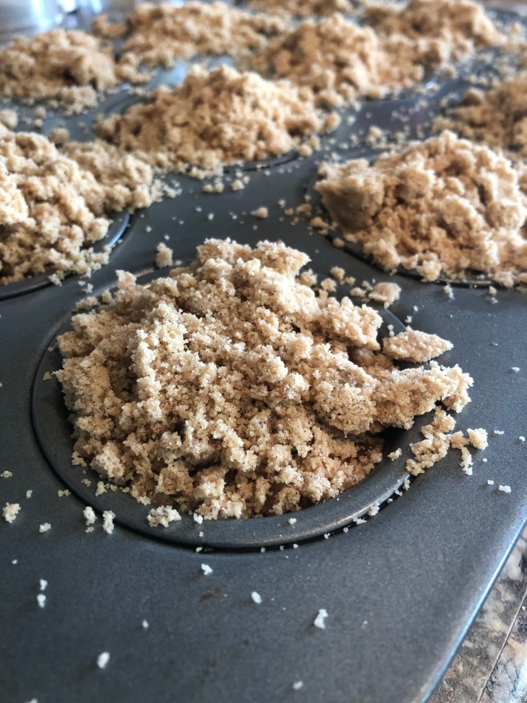 - Using your hands top the muffins with the crumble. I really like to top them, using all the crumble. It’s ok if it is a bit messy.