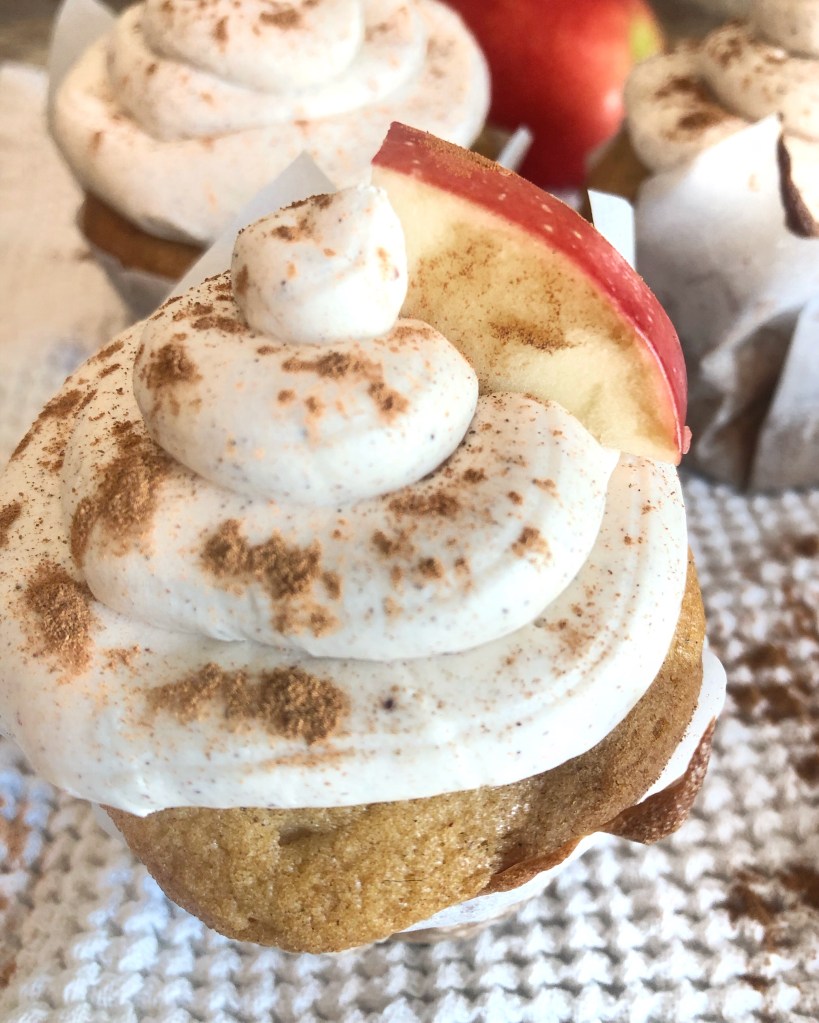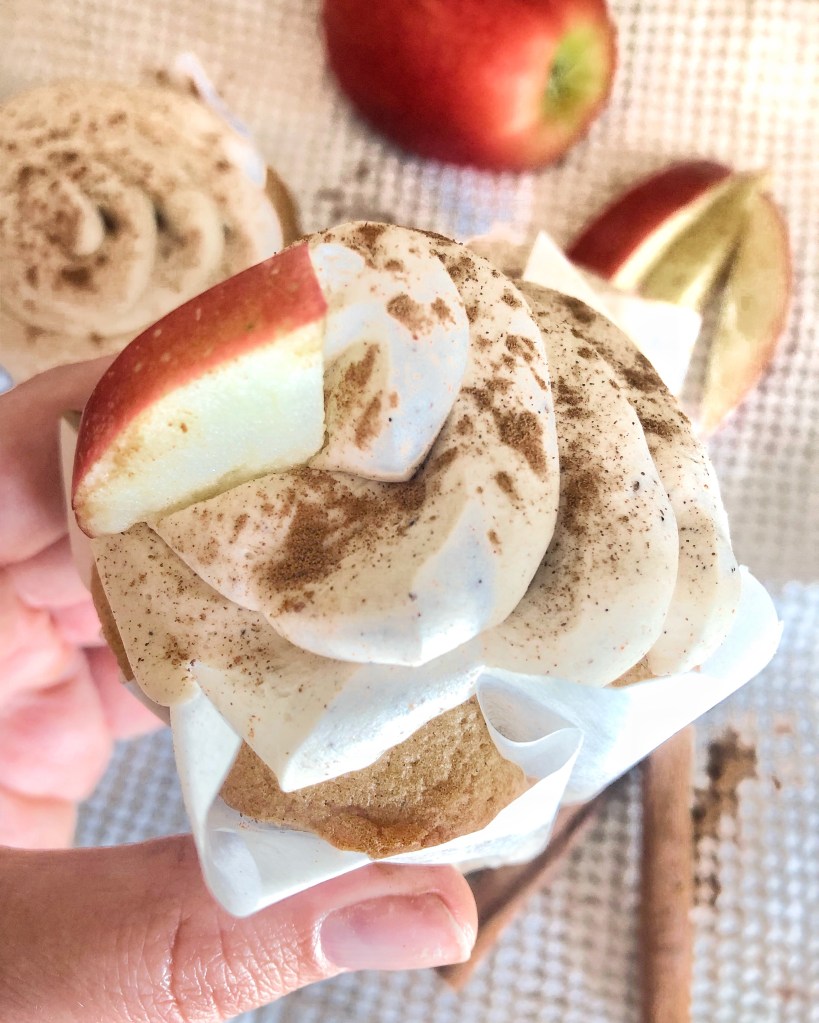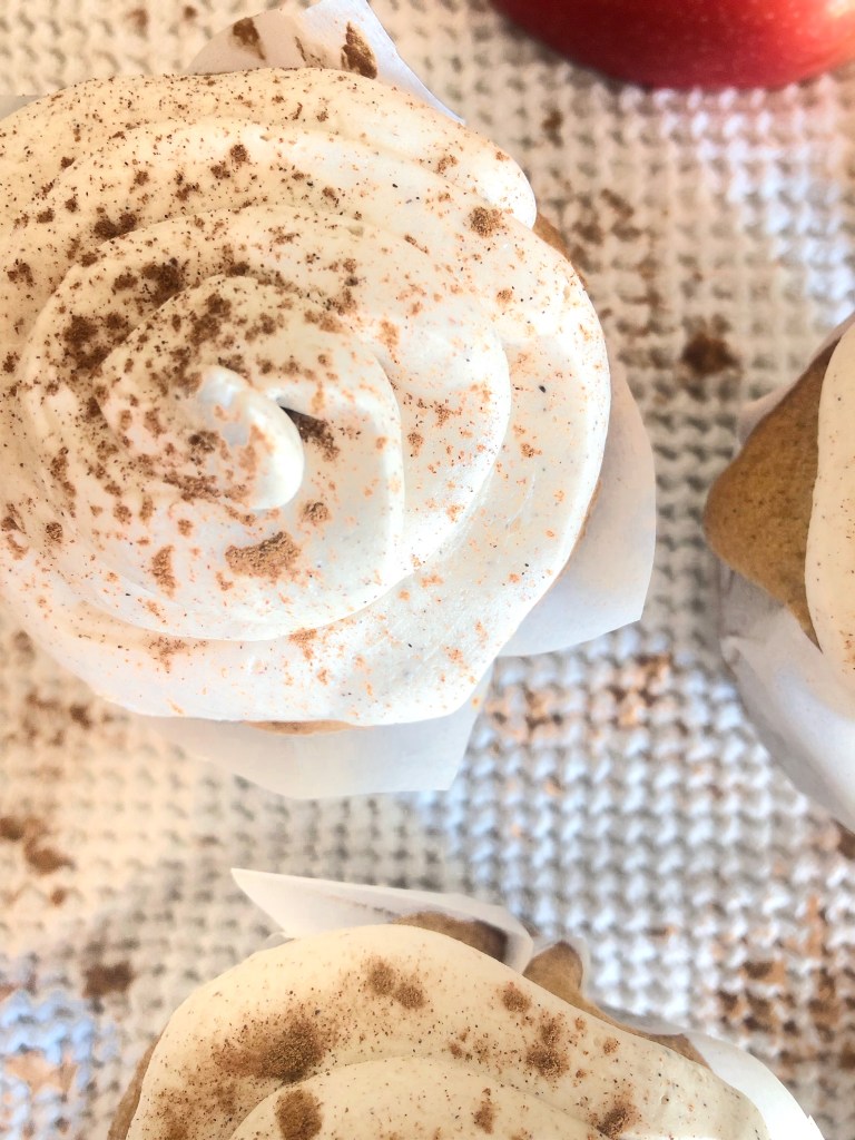 - Once your delicious frosting is on your cupcakes sprinkle with a little cinnamon and top with an apple slice! ENJOY!