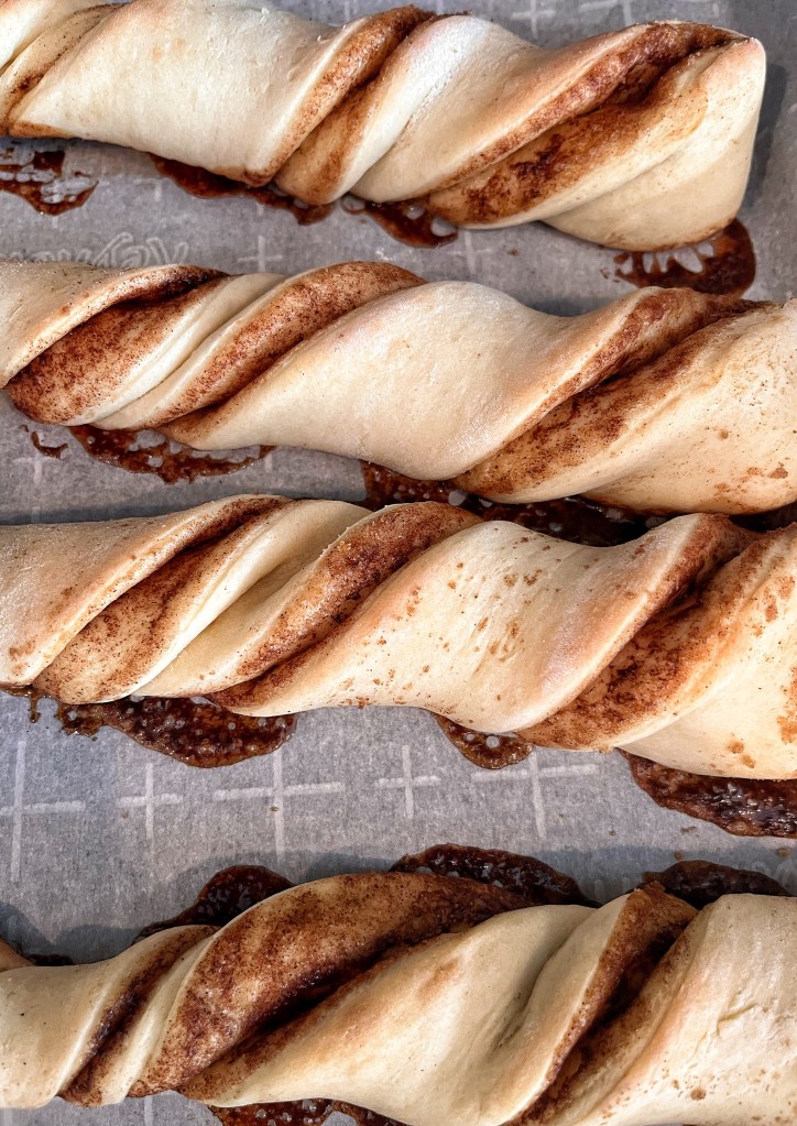 Being able to make a recipe ahead of time is one of my favorite things to be able to do. You can make the twists all the way and then stop before baking them and place them in the fridge for up to 24 hours. This is especially handy for Christmas morning breakfast. Being able to just pull them out in the morning and baking them is the best! Also, if your butter is frozen microwave for 10 seconds then flip and microwave another 10 seconds. Making it nice and soft.