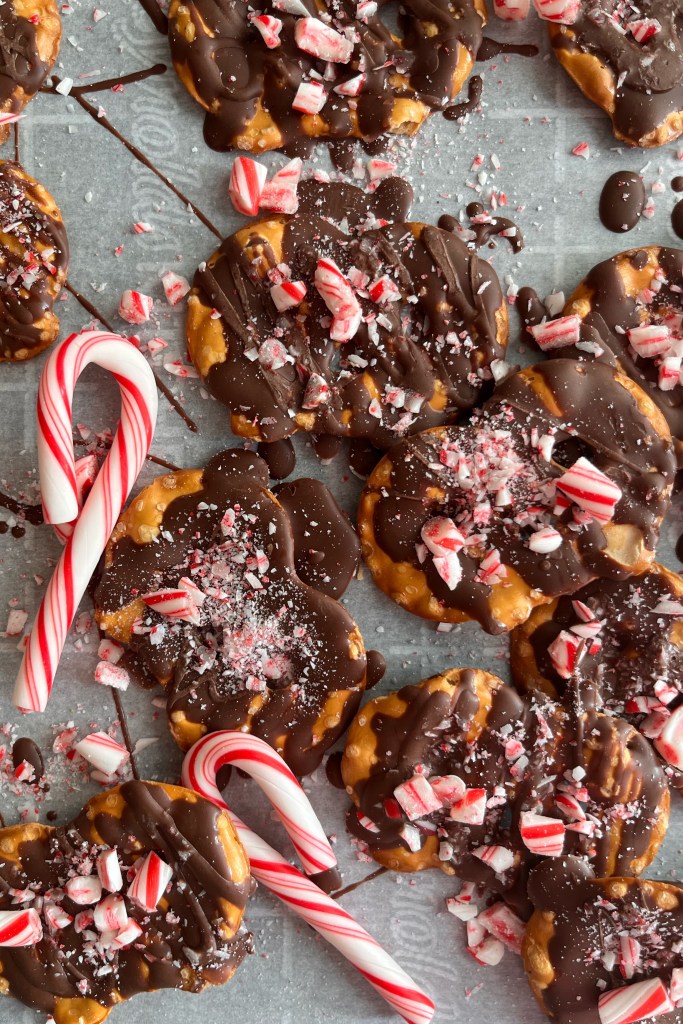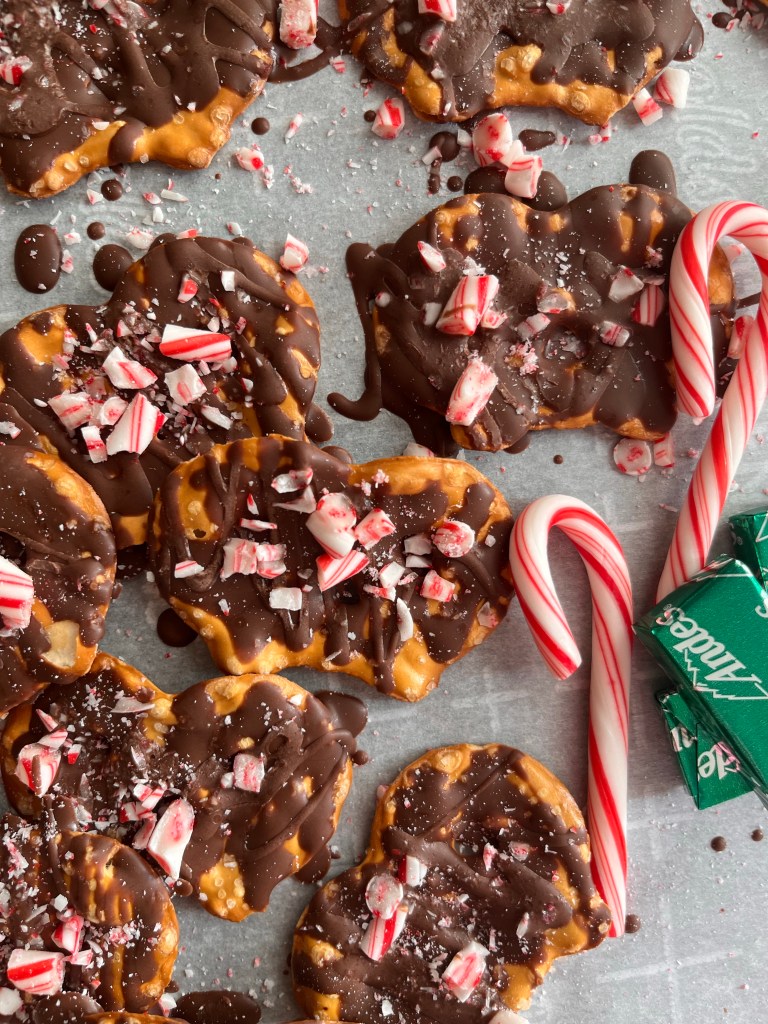 Learn from my mistake! Make sure to have your crushed peppermint ready to go before you drizzle your pretzels with your chocolate. If you wait too long in between putting your chocolate on your pretzels and adding the crushed peppermint, then your chocolate will harden, and your peppermint won’t stick to your chocolate. Also, to crush your peppermint candy canes, I just put my candy canes into a Ziplock bag and take a rolling pin and press down onto the candy canes. I do this until they are the desired size I want.