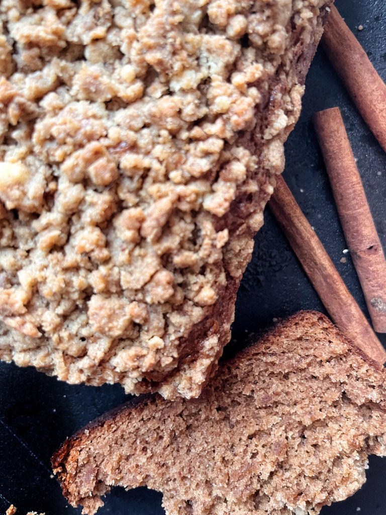 It is the most wonderful time of year for good food. This bread is the best because it makes the perfect breakfast, perfect dessert or perfect addition to a charcuterie board. I make it with my homemade applesauce. It makes the bread perfectly moist. My applesauce recipe is super easy to make and takes hardly anytime. Click here for my applesauce recipe. The crumble topping is what really seals the deal here. It has a nice crunch to it and adds the most amazing touch of sweetness on top!
