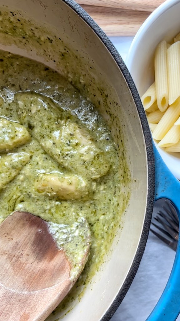 - Leave any juice or small scraps from the chicken in the pot and add in 1 cup milk and 1/2 cup pesto.