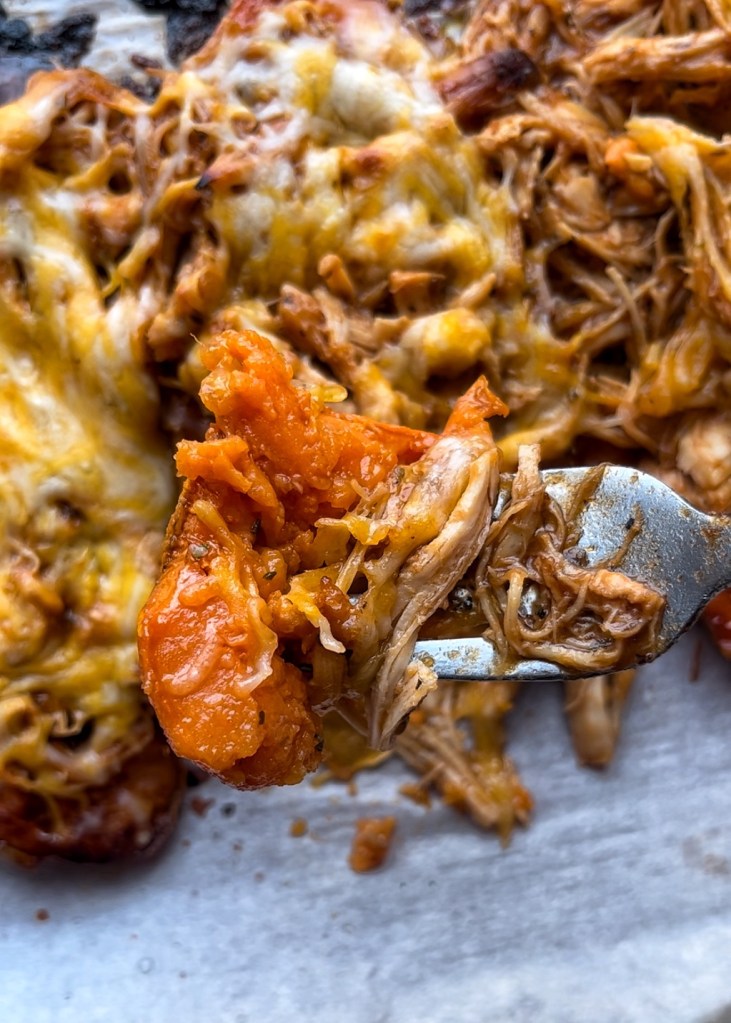 I really really love this dinner for so many reasons, but the main one is how easy it is to toss together. It needs to be at the top of your list to try out. For Loaded BBQ Chicken Sweet Potatoes the hardest part of the whole recipe is cutting the potatoes in half, seriously the recipe is so easy. You can throw your chicken in the crockpot in the morning, and it is waiting for you by dinner. Bake the potatoes, load them up with chicken and cheese, bake again and ta-da dinner is served. Plus, the extra chicken is great leftovers for sandwiches or salads.