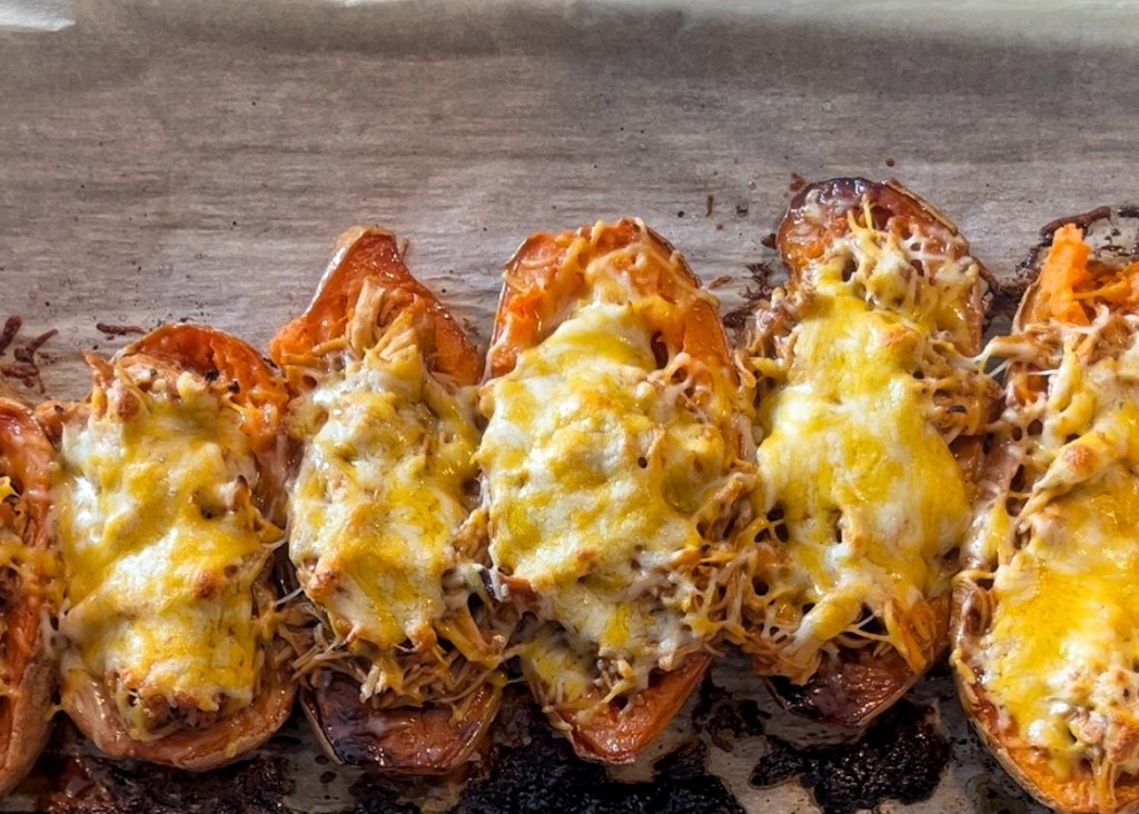 - Using two forks shred your chicken. Fill each sweet potato with shredded chicken. Fill them nice and full.