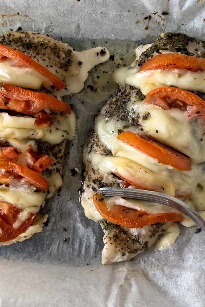 Be careful when you are cutting the slices into the chicken not to cut all the way through. Also, make each slice big enough to be able to stuff with tomato and cheese.